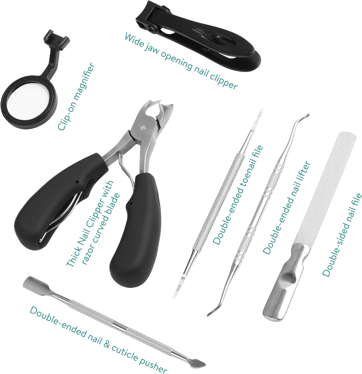 - Unique Clip-On Magnifier: This set includes an exclusive clip-on magnifier, a unique addition that helps seniors and those with visual weakness trim their nails safely. It provides extra visibility where it's needed most.